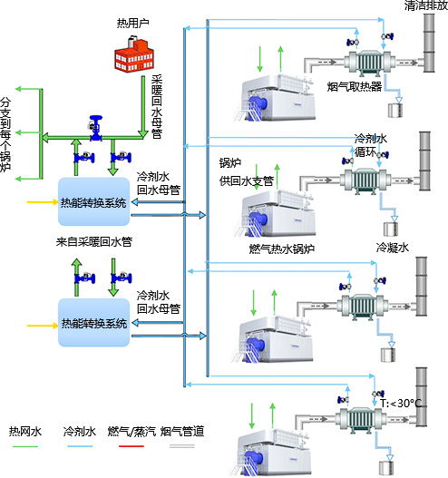 該項目采用雙良清潔能源集成系統,在分析總結煙氣中水蒸汽冷凝率與排煙溫度的關系、冷凝率與熱效率的關系等研究結果的基礎上,采用雙良核心燃燒技術及超級冷凝技術,將鍋爐排煙溫度降至30℃以下,充分吸收利用煙氣中的顯熱和水蒸汽凝結過程中釋放的汽化潛熱,大幅提高燃氣利用率,降低供熱系統能耗,熱效率可達108%。